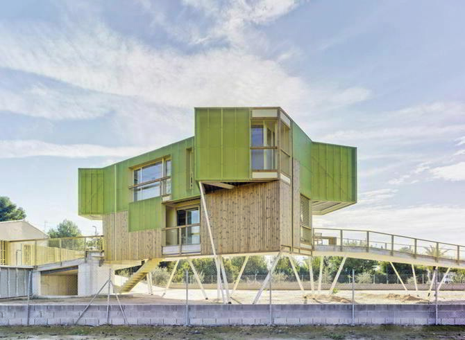 Si continuamos nuestro recorrido hacia el este, en la Sierra de Abanilla, llegamos a una plantación de mandarinas ecológicas que sustenta su equilibrio agrario a través de insectos depredadores. Allí se inserta una pequeña construcción, las Oficinas autosuficientes Mandarina Coleóptera, un proyecto que choca por su escala doméstica y que se adapta al espíritu de su objetivo comercial, siendo un edificio autosuficiente completamente autónomo (con un sistema integral para el agua: recogida, acumulación, potabilización, depuración; una captación solar para la energía eléctrica; y un sistema de climatización de aire de doble flujo por pozo canadiense). Un edificio insertado en la propia plantación, que te incita a ser atravesado hasta un punto final que se eleva sobre los campos, a modo de mirador 360º.