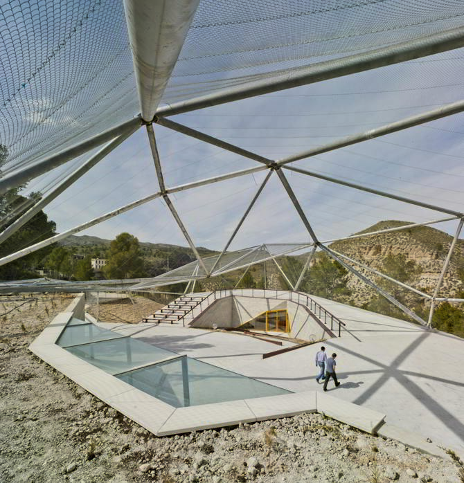 Rodeado por Patrimonio arqueológico, accidentes geográficos y hectáreas de almendros en flor, encontramos el Centro de Interpretación del Cañón de Almadenes, un edificio público finalizado en el año 2015 que consigue integrarse en este inmenso paisaje. Localizado junto al cañón, una garganta natural de varios km con paredes laterales que superan los 100m, el proyecto emerge como una charnela que nos permite asimilar este ecosistema desde dos vías; por un lado, desde el conocimiento que se propone adquirir al visitarlo, y por otro, desde el propio diseño del mismo, con una distribución espacial y material que se adapta a lo preexistente, además de una propuesta energética que lo sitúa como primer edificio público de energía cero en España.