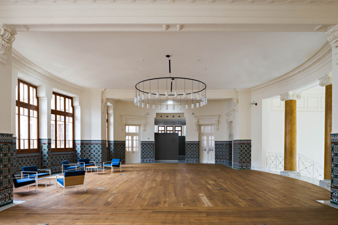 En el interior los grandes vestíbulos centrales se manifiestan como espacios de encuentro y esparcimiento entre las aulas, abiertos a la luz en un eje norte/sur y conectados con una gran escalinata rematada con una vidriera de los antiguos talleres de La Veneciana.