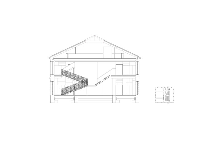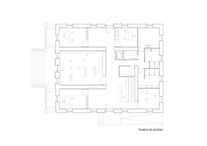 La escalera y los muros originales organizan el vestíbulo de acceso y la distribución interior. Una franja central como espacio único contiene las comunicaciones horizontales y verticales tanto en planta baja como en planta primera, y permite acceder a todas las aulas, talleres y despachos. Junto a la escalera principal se sitúan el ascensor y otra escalera que da acceso, desde la planta primera, al espacio bajo cubierta.