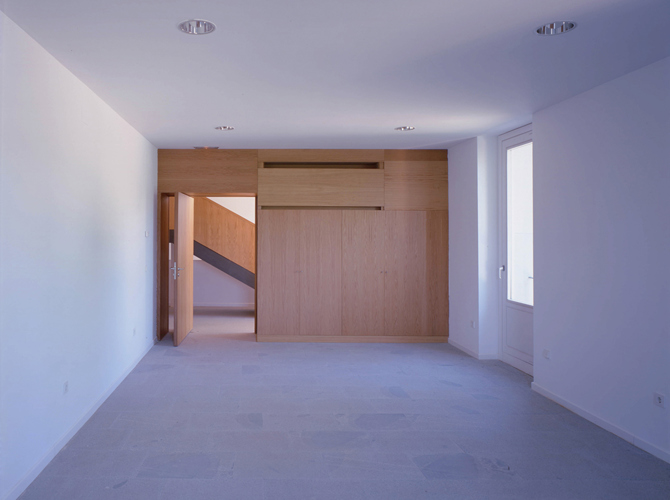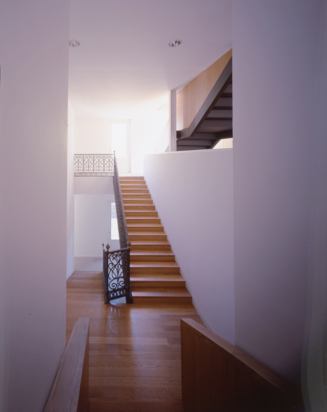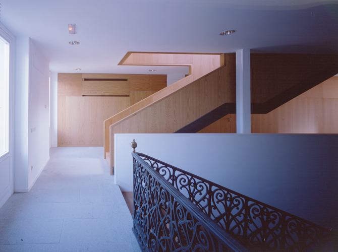 La intervención ha pretendido el uso de un número mínimo de materiales. Revocos en muros exteriores con carpinterías pivotantes de madera pintadas de blanco. En el interior, madera de roble en escaleras y particiones y suelo de granito a corte de sierra son los materiales básicos. Creemos que estos dos únicos materiales realzan por su sencillez un edificio cuyo principal protagonista está en el espacio de la escalera y su barandilla original de hierro forjado.