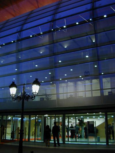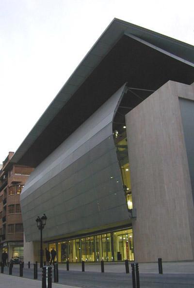 La otra idea importante y fuerte ha sido el tratamiento de la fachada: se ha optado por una solución rabiosamente moderna, o al menos su lectura más rápida, en la línea del famoso high-tech. Se trata de una especie de parasol neutro que los arquitectos explican como un telón. De día, todo lo tapa. De noche, con la iluminación interior, desvela a la ciudad la auténtica escena que es la que configura el público con su asistencia.De este modo ocurre como antes ocurrió: que se acude a ver y a ser visto, cuestión no baladí en una ciudad de provincias que quiere y no quiere dejar de ser tal.