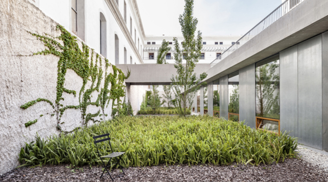 Se reutiliza la antigua construcción de planta hexagonal como lucernario del edificio subterráneo para asegurar la entrada de luz natural en el centro de la nueva construcción.