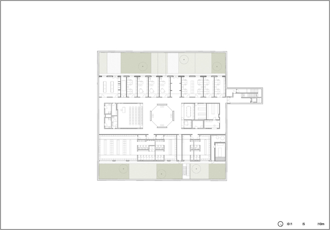 A nivel de uso el proyecto mantiene el programa más público en la planta baja y reubica las dependencias más privadas del cuartel; como despachos, vestuarios y salas de reuniones en la edificación subterránea, en el centro del patio.