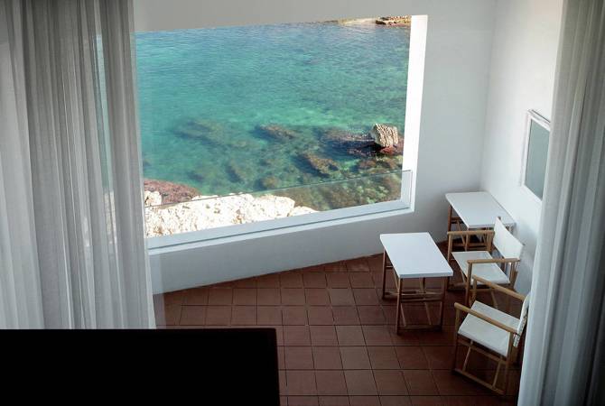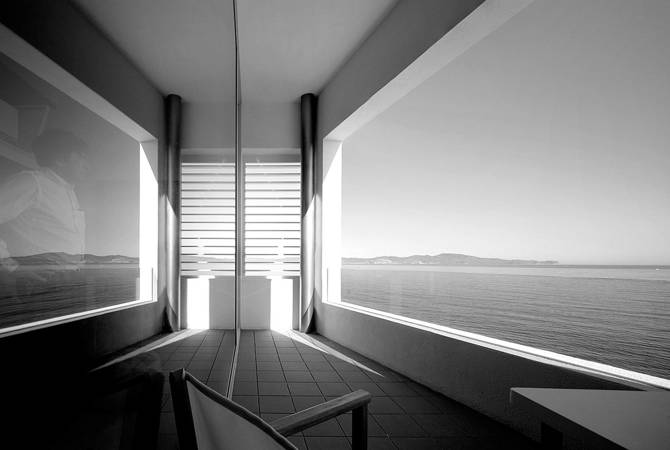 La verdadera ventana la constituye el gran vidrio retirado hacia el interior, que construye un pequeño espacio intermedio de terraza y dejando que sea una perforación del muro de fachada la que encuadra la vista a levante hacia el golfo de Roses. Dicha orientación permite ver amanecer y, con el sol ya alto, desde la sombra interior, disfrutar del paisaje iluminado el resto del día. Sentado en el interior, el perfil del vidrio de la barandilla exenta coincide con la línea del horizonte y los altos cortinajes (una cortina a doble altura) otorgan la condición escenográfica del paisaje como argumento.
