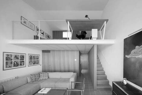 Un único espacio con altillo destinado a dormitorio, aprovechando la altura que permite la sección y la inclinación de la cubierta, acoge una pequeña sala-estar-comedor-office y baño, que permite su uso como un elemento independiente dentro de la vivienda. La cubierta de teja, tal y como marcaban las directrices urbanísticas, se alabea para permitir la horizontalidad de la cumbrera debido a la geometría de la parcela.