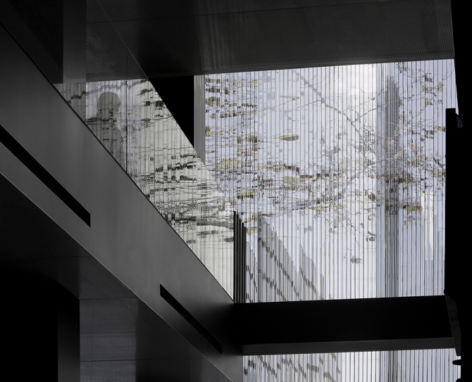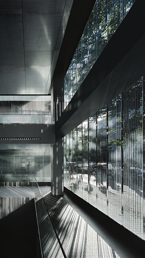 Planteamos una solución para la fachada basada en la forma de disposición de un único material, una sucesión de múltiples vidrios dispuestos perpendicularmente al eje de fachada. Fue la luz, tanto natural de día como artificial de noche, la que se convirtió entonces en protagonista. Así desde el exterior, cuando miramos hacia el interior del edificio la fachada nos ofrece una visión ambigua de su interior haciendo necesario entrar en él para descubrirlo realmente. Una vez dentro, si miramos hacia el exterior, hacia la ciudad, observamos toda una serie de efectos visuales casi como si de un juego se tratara, en donde nada está donde realmente debería estar. Unos rayos de luz atraviesan en línea recta mientras que otros se reflejan produciendo algo parecido a una superposición de la imagen. Otros, al mismo tiempo se difractan para mostrarse en todos los colores del arco iris.