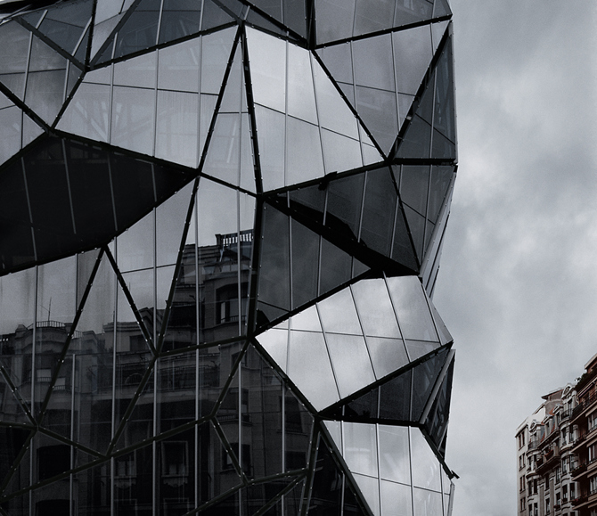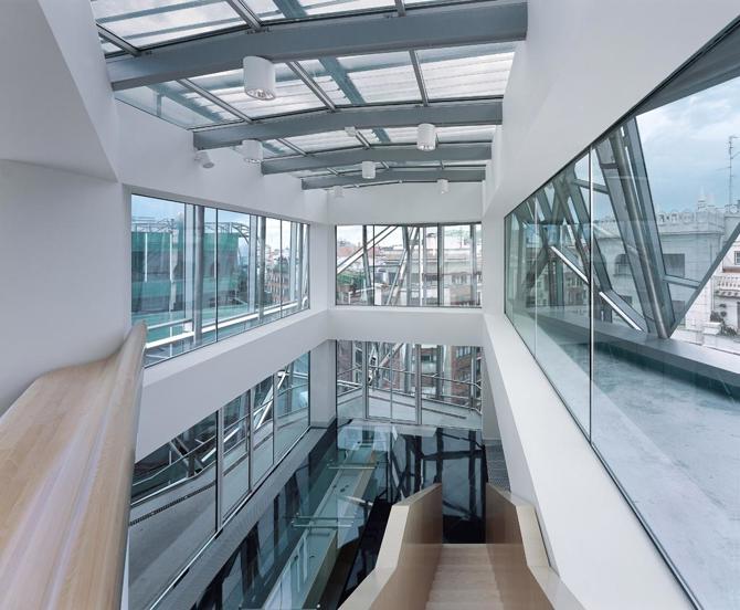 Los pliegues de la fachada producen visuales múltiples desde el interior hacia las calles que se cruzan y, desde las últimas plantas, hacia el paisaje que circunda la ciudad; producen también un espacio situado entre las dos fachadas, el cual se comporta simultáneamente como un interior que pertenece a la ciudad y un exterior que pertenece al edificio. Ambas circunstancias resultan en un mecanismo de gran eficacia para la incorporación del vitalismo urbano en el interior del edificio. El proyecto recupera así ese lugar tradicional donde sentarse junto al edificio, sobre el umbral, en la puerta de una casa, con la mirada hacia el camino y la espalda hacia el hogar.