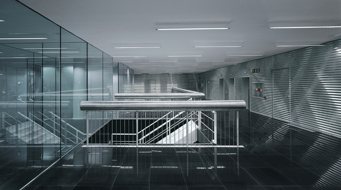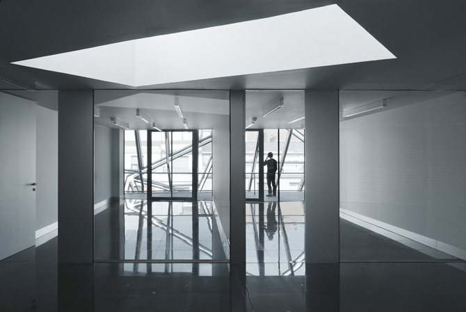 Una doble envolvente resuelve no solo los requerimientos urbanísticos sino también los energéticos, los de resistencia al fuego del edificio y el aislamiento acústico del exterior. El beneficio climático que se obtiene permite eliminar el aire acondicionado tradicionalmente entendido y, con él, los falsos techos de las oficinas. Por tanto, se minimiza el sonido producido por el edificio, desaparece totalmente la recirculación del aire en los lugares de trabajo, con un importante aumento de las condiciones de higiene laboral, y se reduce el volumen ocupado por cada planta construida, con el consiguiente ahorro de recursos consumidos por la construcción.