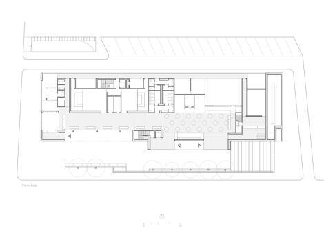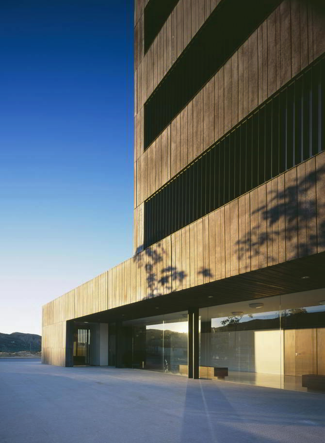 Con tan pocos alicientes iniciales, el dialogo entre lugar y arquitectura quedaba muy reducido. Esta forzada autonomía nos llevó a considerar una arquitectura contenida y compacta, desarrollando un edificio en longitud, en una gran plataforma pública de la que emerge un prisma de gran rotundidad como torre de juzgados.