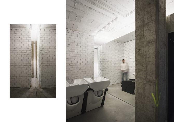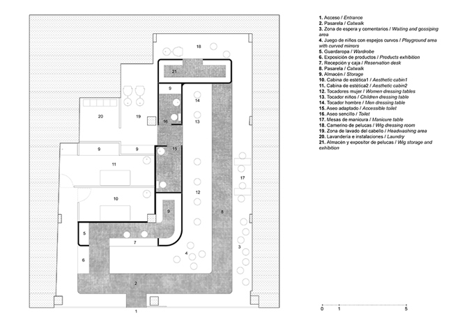 A través del recorrido dentro del espacio de la peluquería y gracias a una superficie espejada continua, con zonas convexas, cóncavas y planas, el proyecto pretende generar en el visitante diferentes sensaciones dependiendo de su posición y la imagen reflejada que obtiene en cada momento de sí mismo y su entorno. El usuario verá una realidad distorsionada y ampliada durante su recorrido desde la entrada, atravesará el espejo llegando al otro lado, donde se realiza el lavado del cabello, y en la zona de trabajo donde el espejo se mantiene plano podrá, de reojo, observar diferentes distorsiones de lo que ocurre a su alrededor.
