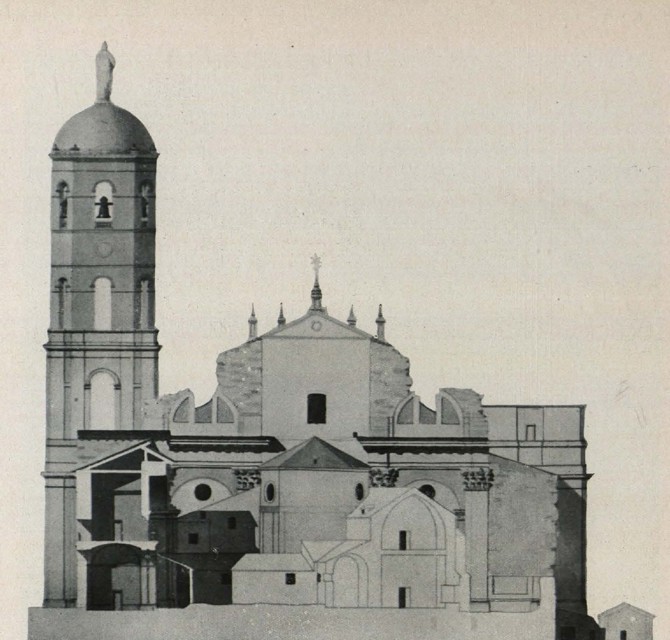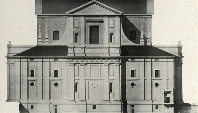 El acortamiento del brazo de la capilla mayor no podía admitir la desproporción con que quedaban los brazos laterales según el proyecto total. Una prueba documental es la fotografía de nuestra planta de conjunto, donde están estudiadas las masas con las sombras proyectadas. El triple ventanal del medio punto se ha impuesto al modo herreriano, perforando la parte alta de los muros de la nave central, y los contrafuertes vuelven a su línea razonable tal como lo propuso el gran arquitecto.