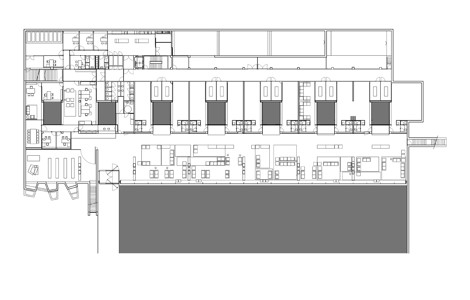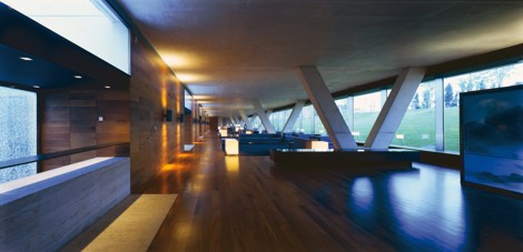 Situado delante de una gran zona verde, demasiado cerca de un barrio residencial, el edificio se entierra bajo un estanque de agua para integrarse en el entorno natural y facilitar su relación con las viviendas vecinas.