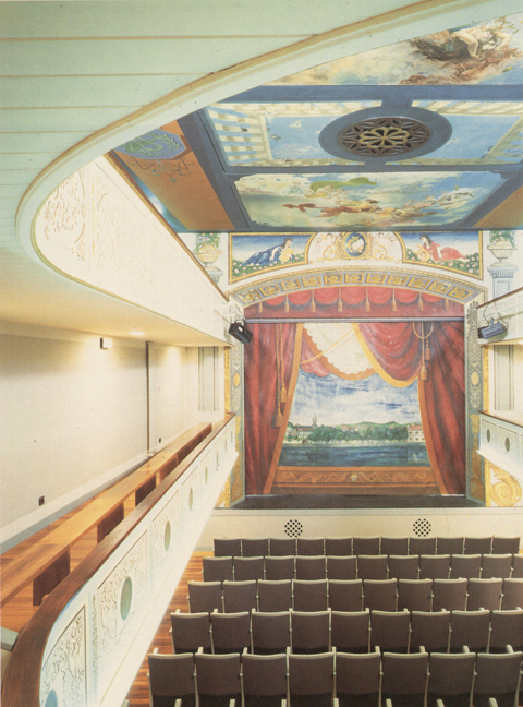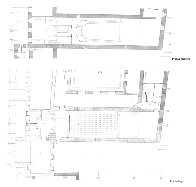 El teatro quedó conformado por una platea rectangular, con ligera caída hacia la escena, y entrada directa desde el claustro y una zona de escena elevada respecto a la platea, con dos alturas de techo, una apretada escalera de caracol de acceso a puentes y pasarelas, muy elementales, como toda la dotación escénica.