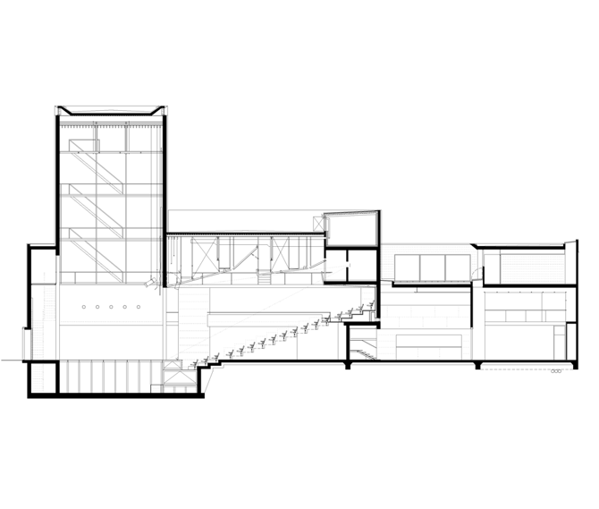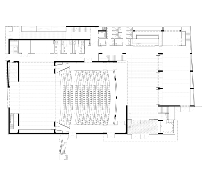 El espacio urbano de la entrada se reorganiza resolviendo, de forma también puntual, las diferentes situaciones y asumiéndolas en un nuevo trazado, configurado a la escala del nuevo equipamiento cultural. La sala y el escenario se han planteado como un teatro a la italiana, con la sala y el escenario diferenciados, pero que pueden llegar a convertirse en un espacio polivalente, con la cobertura de las tres primeras filas de la platea y el repliegue de la grada.