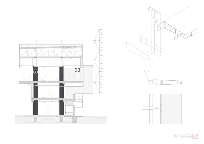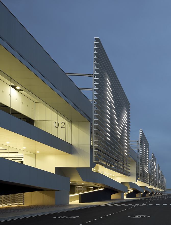 Estructura de hormigón y acero con losas postesadas de hormigón. Fachadas en seco con revestimiento de chapa de aluminio anodizado. Cubierta tipo Deck de bandejas de aluminio lacado engatillado con atenuación acústica.