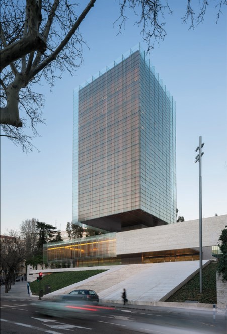Está conformado como un paralelepípedo de vidrio de plantas cuadradas y diáfanas, el cual se cuelga desde la plataforma en ménsula de un núcleo de hormigón de comunicaciones y servicios, que se sitúa descentrado en su parte posterior, pareciendo flotar así sobre un cuerpo horizontal de basamento al que no llega a tocar.