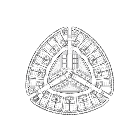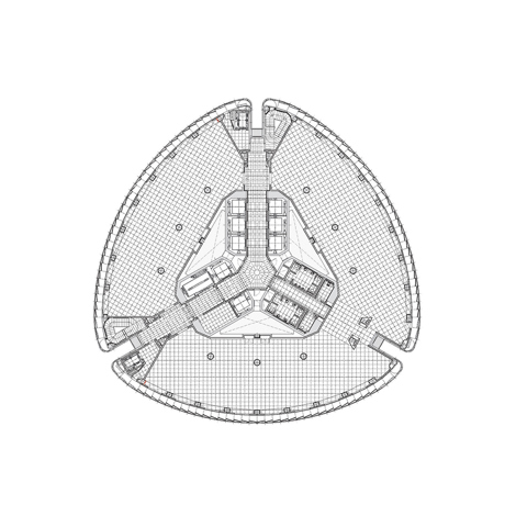 El edificio, que está construido en los antiguos terrenos de la Ciudad Deportiva del Real Madrid, se basa en la propuesta ganadora del concurso presentado en abril del año 2003. El entendimiento de la torre se efectúa a partir del análisis de geometrías rigurosas, capaces de albergar diferentes usos y aportar la flexibilidad necesaria a lo largo de la vida útil del conjunto. Desde las primeras concepciones del rascacielos, la razón de ser principal de esta tipología reside en el apilamiento de usos y entornos diferentes. En este caso, el edificio se configura mediante la superposición de un centro de congresos, un hotel y unas oficinas. El hotel ocupa los dos tercios inferiores del edificio y sobre él se proyectan 17 plantas de oficinas en alquiler. Los órdenes de geometrías principales se generan a partir de un triángulo equilátero y tres circunferencias tangentes, optimizando la longitud de fachada para la superficie construida de cada planta. Tres pliegues verticales dividen el edificio en “gajos”, haciéndolo más esbelto e introduciendo luz natural y ventilación en el núcleo central. Este núcleo recoge los empujes horizontales del viento, las instalaciones verticales y los ascensores principales. Cada una de las plantas se articula en tres sectores de incendio diferentes, segregados con vestíbulos ventilados, situándose las escaleras de evacuación en las esquinas.