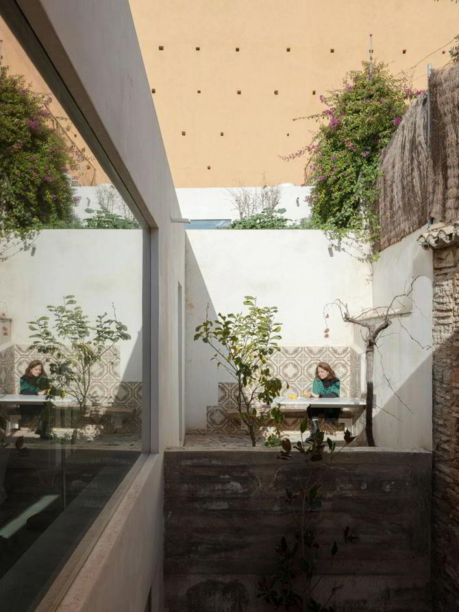 A excepción de la primera crujía de teja árabe, como es tradición y norma en el centro histórico de Granada, el resto de la parcela se convierte en zona verde, con un sistema que reutiliza las aguas de las duchas para garantizar el riego de huerto y jardín incluso en los meses de verano sin consumo extra de agua.