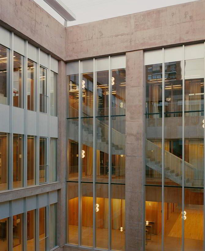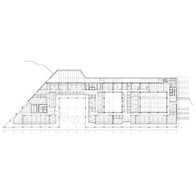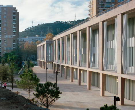 - Construir dos grandes paseos planos que atraviesen el solar horizontalmente y lo conecten con los barrios de Montbau y Sant Genís. 3. Crear un nuevo eje vertical de acceso mediante escaleras mecánicas que solucione la accesibilidad tanto del Campus como de los barrios adyacentes. El primero de los edificios que inicia esta gran transformación es el centro de investigación del Vall d'Hebron VHIR. Se trata de un edificio empotrado en la montaña con una sola fachada. Un pliegue de la topografía que quiere ser un telón de fondo de la plataforma inferior y que desaparece literalmente desde el nivel superior donde se convierte en una prolongación del paisaje de la montaña de Collserola. La planta está definida por tres patios, uno de los cuales se abre en la fachada y construye una plaza, y unas terrazas que recorren toda la fachada y relacionan los laboratorios con el exterior. Los laboratorios, agrupados en torno a los tres patios, generan una serie de recorridos, combinando interiores y exteriores para generar espacios de ocio y encuentro.