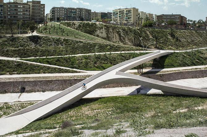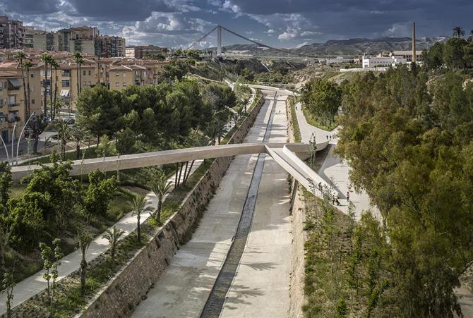 El sistema pretende dar voz al río Vinalopó. Las sinuosas trenzas no guardan relación con la ortogonalidad de la ciudad. Estas líneas onduladas dan forma a estas zancadas. Ofrecen rutas más cómodas e incorporan la posibilidad de cruzar el río para continuar el paseo. Los caminos que flotan sobre el intocable cauce de hormigón se convierten en los héroes de la reconquista. Y desdibujan la diferencia entre puente y camino, convirtiéndose en un pensamiento gráfico resuelto por una abstracción material. Un solo puente se convierte en una red de senderos que se pliegan, se doblan, se estiran, se tensan, se dispersan, se curvan y, por supuesto, se tuercen.