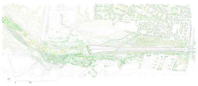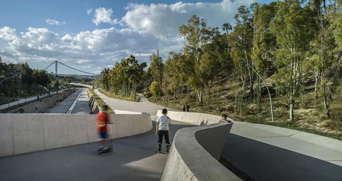 La vegetación también es un material. Las especies autóctonas y los árboles ayudan a construir la sombra del bosque. Un sistema basado en la experiencia, la comprensión y la empatía para conectar con la elegancia, ambos tramos que dividen Elche. El valle ya ha comenzado a trenzarse, ahora reducido a mínimos infraestructurales, y con el tiempo permitirán el florecimiento de las actividades urbanas.