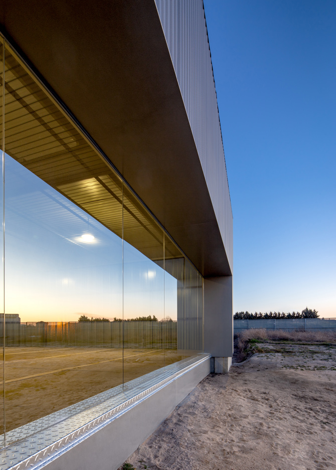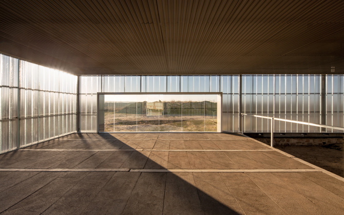 Los pabellones “completan”, en cierto sentido, la ruina, dando mayor información al visitante al recuperar el espacio interior de las estancias. Para ello, se construye una doble fachada que reproduce las caras interior y exterior del antiguo muro romano, así como su espesor original: la cara exterior se realiza mediante la misma chapa ondulada micro-perforada de la valla, mientras que la cara interior es un cerramiento continuo de “u-glass”. Entre las dos caras se sitúa la estructura de acero; todo ello apoyado sobre módulos reversibles de hormigón prefabricado, colocados sobre el saqueo del muro romano.