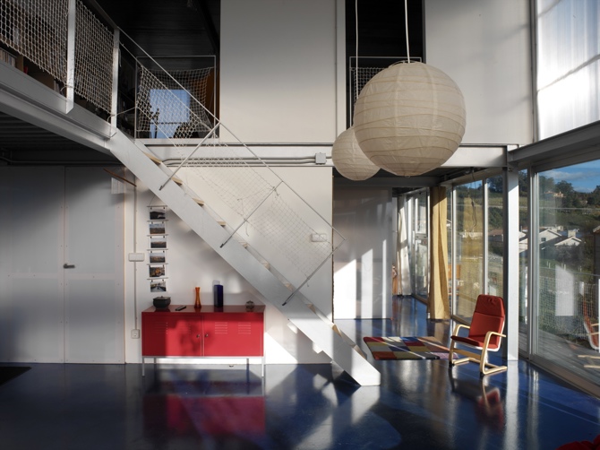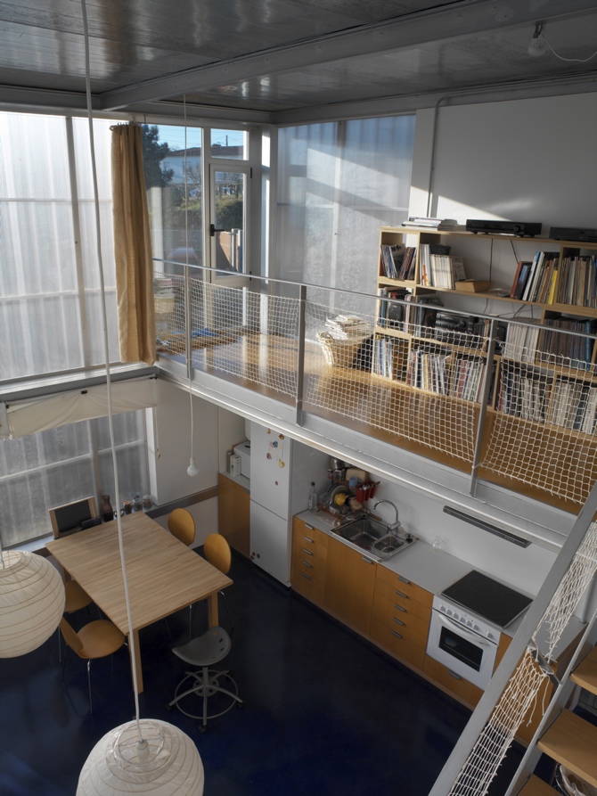 No se entiende la vivienda, pues, de modo restringido sino más bien como la suma de espacios exteriores, intermedios y cerrados. El volumen cerrado se sitúa en cota superior ya que lógicamente será el centro de la vida durante los meses no estivales y se entiende como un espacio único proyectado y volcado hacia el entorno. Se cierra con una fachada multicapa resuelta al exterior con un único material, policarbonato ondulado, que se dobla al interior de modo variable según el carácter predominante de la porción de volumen que envuelve y su orientación. En la orientación norte la fachada se compone de termoarcilla revestida con perlyescayola, aislante proyectado de alta densidad, y el forro de policarbonato. En las fachadas sur y poniente el policarbonato ondulado se trasdosa de modo ventilado con policarbonato celular, y es sustituido por vidrio en las partes practicables y que abren al paisaje el interior. La cubierta es solamente aislante y se resuelve con doble uralita con poliestireno intermedio.