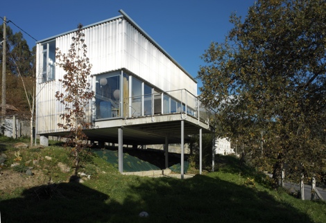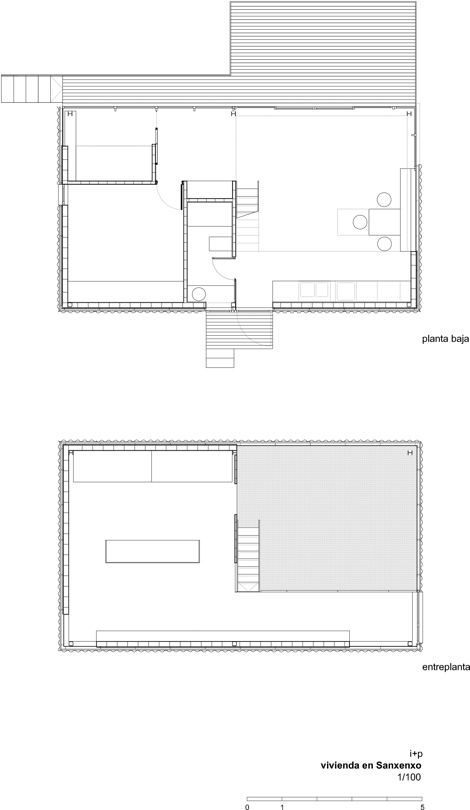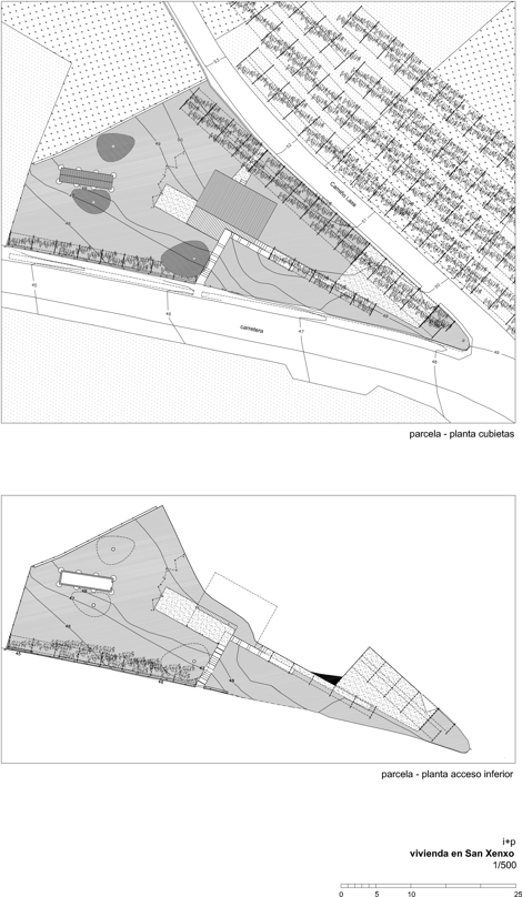 La parcela se encuentra en una ladera con pendiente al suroeste que se abre visualmente a la boca de la ría de Pontevedra. Es un paisaje de prados y viñas salpicado de viviendas unifamiliares todavía en una proporción donde estas solo puntean las masas de vegetación. El terreno es de pequeña dimensión, sus linderos son dos carreteras y debido a su situación en ladera es posible si nos situamos en la cota inferior o superior de la parcela reducir dramáticamente el alcance de nuestro entorno o proyectarlo hasta la línea del horizonte desvaída del mar. Por otro lado, el carácter turístico durante dos meses al año de la zona hace que la exposición al entorno lejano de la parcela haya que controlarlo o matizarlo durante esta época. El proyecto parte de explotar al máximo las condiciones de la parcela y su entorno y generar un mecanismo capaz de múltiples flexibilidades, de uso, de carácter, de presencia, de exposición, de respuestas térmicas y ambientales, etc.