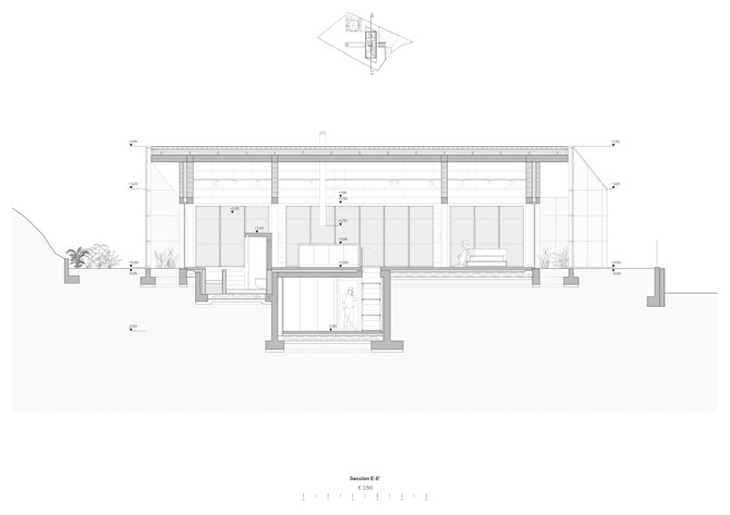 Al volumen de nueva planta se la añaden dos espacios bajo rasante, uno para ubicar las instalaciones de servicio del conjunto y otro relleno de agua para el baño (piscina), generando un recorrido de entrada y salida desde el exterior y el interior como eje transversal bajo el volumen principal.