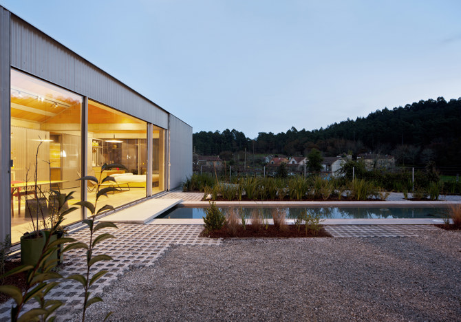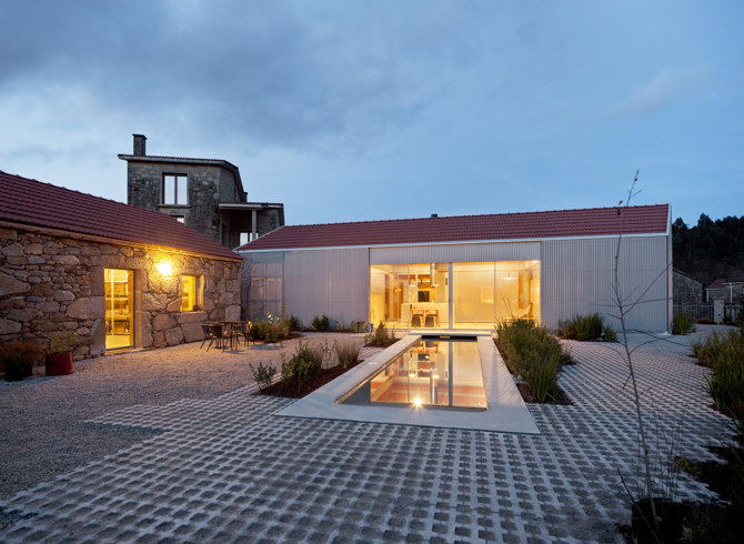 La disposición transversal de la nueva edificación con respeto a la existente y al eje dominante de la parcela responde a entender la pieza como el límite conceptual entre lo público y lo privado. De esta forma se genera desde el acceso a la parcela una secuencia de espacios ambiguos que van incrementando con sutileza los niveles de privacidad e intimidad, sin necesidad de la instalación de soluciones de cerramiento sobreactuadas. El espacio delimitado por las dos edificaciones responde a un tradicional esquema de eira o curral, convirtiéndose en un elemento de conexión e interacción entre las dos piezas. Esto permite abrir en su totalidad las estancias comunes de la vivienda al exterior y acentuar ese factor de conexión, fluidez y continuidad. Las estancias que requieren un mayor nivel de privacidad como son el dormitorio y el baño se sitúan en los testeros, vinculándose al exterior a través de un pequeño rincón verde situado entre la edificación y el cierre de la parcela, lo que contribuye a desahogar estas estancias manteniendo una cierta intimidad.
