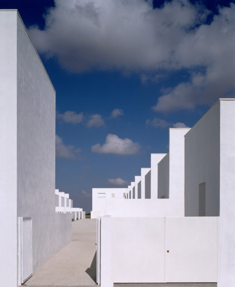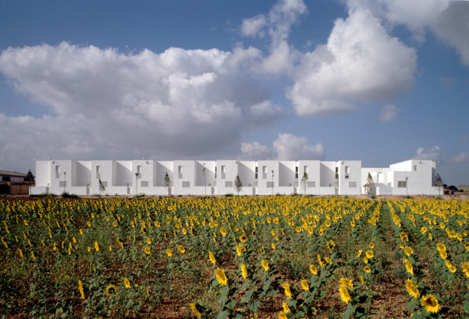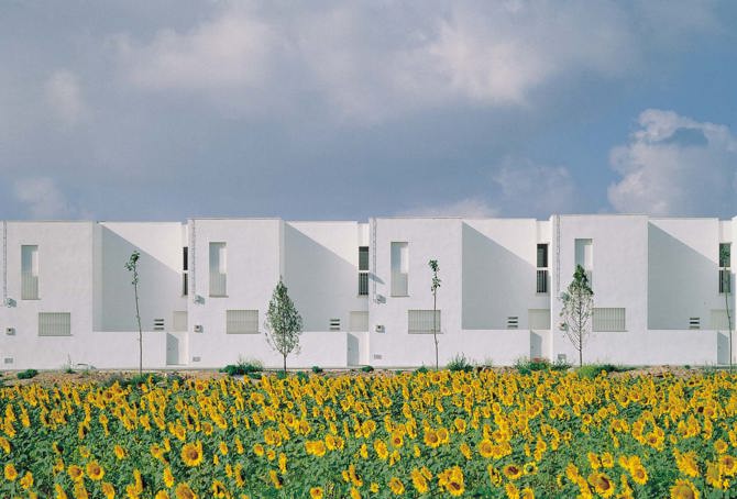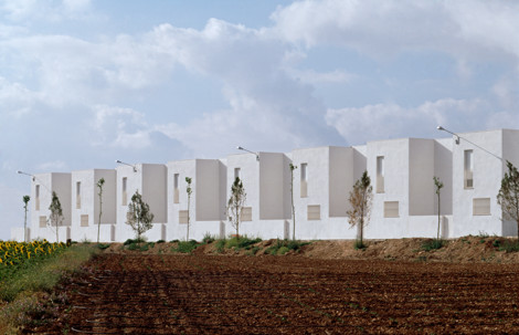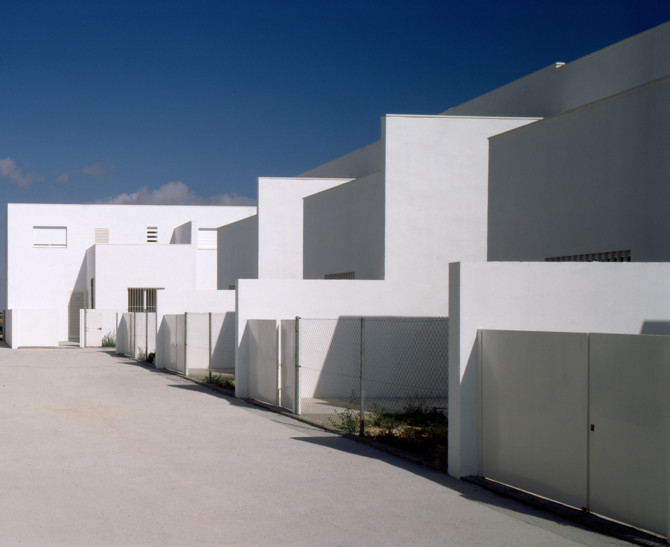 Sobre la explanada del antiguo campo de fútbol, situada en las afueras del pueblo, el planeamiento prevé la construcción de tres manzanas de viviendas adosadas. Se han dispuesto 4 hileras de 8-2-8-2 viviendas, de tal manera que cada una de ellas presenta uno de sus testeros en cada una de las esquinas de la manzana, iniciando así la alineación del frente de la siguiente hilera.