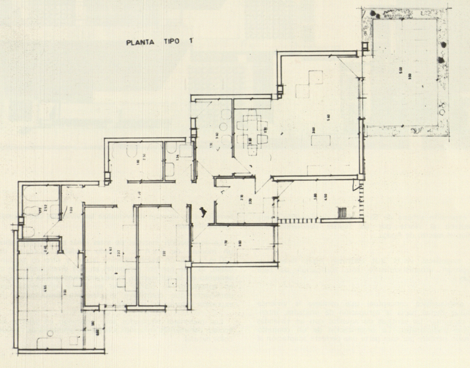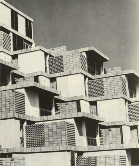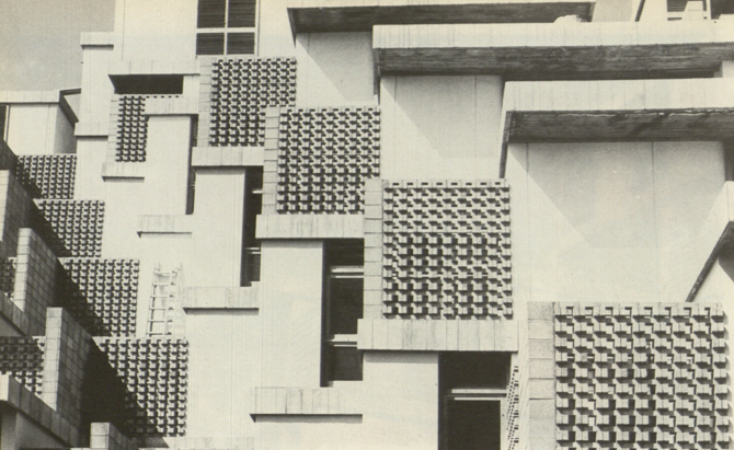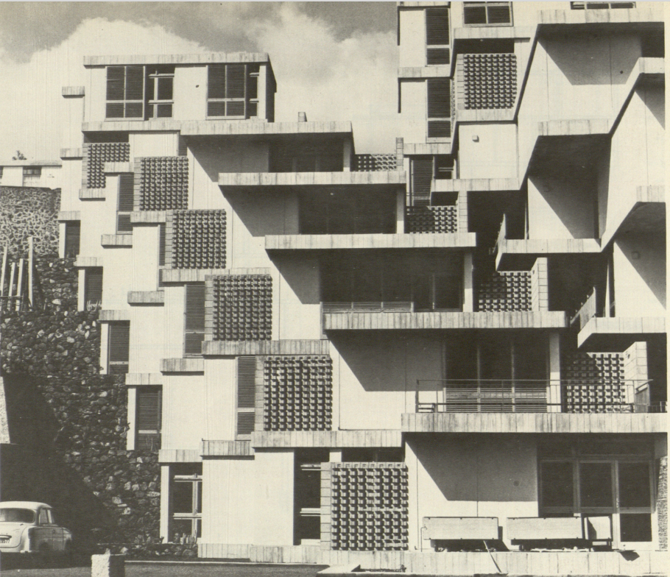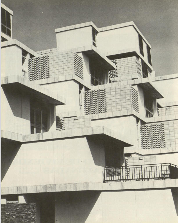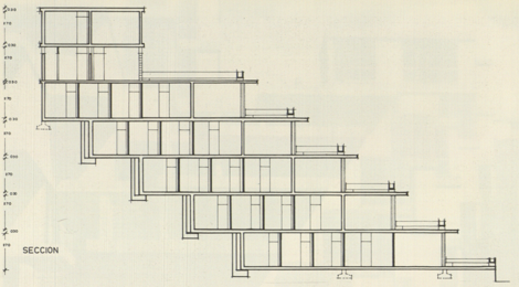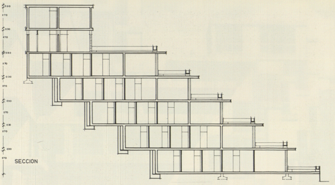 La concreción material de estas ideas se organiza sobre un módulo de 4 x 4 m2 dando unidades apareadas de 120 m2, con un desplazamiento lateral y otro en profundidad, lo que permite agruparlas en dos direcciones. En el conjunto de la edificación, escalonamientos que se producen no solamente en planta sino en altura, ofreciendo una dominante que constituye el elemento fundamental de expresión exterior del edificio.