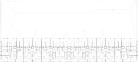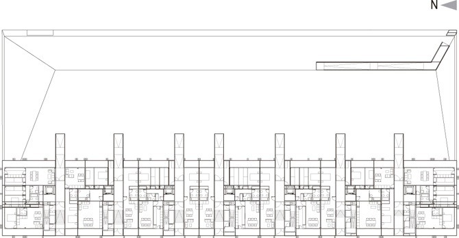 Dada la adyacencia a un futuro parque urbano y la orientación norte-sur del sitio, nuestra propuesta es compactar el volumen dentro de la altura dada para proporcionar un jardín privado para las unidades en el lado este y producir unidades de doble aspecto enfrentadas a ambos jardines. Para lograr esto, las unidades se convirtieron en tubos alargados que conectan ambas fachadas.