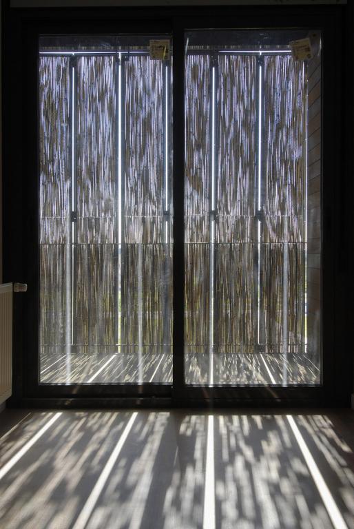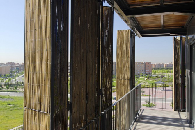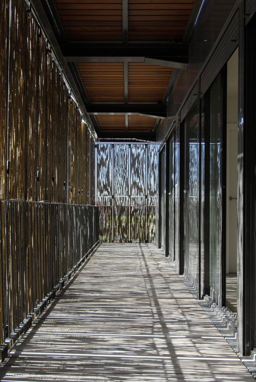 Gracias a la compacidad del bloque, logramos proporcionar fachadas totalmente acristaladas para todas las superficies exteriores. Las fachadas se han revestido con una terraza de 1,5 m de ancho que proporciona un espacio intermedio semiexterior, encerrado por mamparas de bambú montadas en marcos plegables. Las pantallas protegen las superficies acristaladas de la fuerte exposición solar este-oeste y pueden abrirse a los jardines laterales cuando se desee.