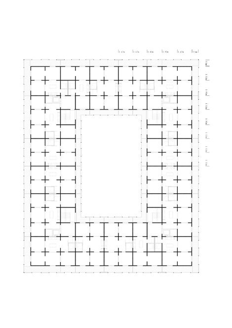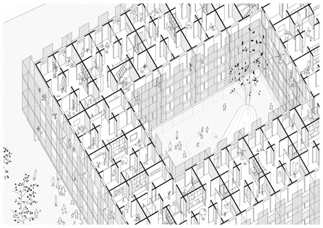 La edificación se organiza alrededor de un patio que articula una secuencia de espacios intermedios. En planta baja, un pórtico abierto a la ciudad anticipa la entrada al edificio y filtra la relación entre el espacio público y el patio vecinal, que actúa como una pequeña plaza para la comunidad. En lugar de entrar directa e independientemente desde la fachada exterior a cada vestíbulo, los cuatro núcleos de comunicación vertical se sitúan en las cuatro esquinas del patio, de manera que todos los vecinos confluyen y se encuentran en el patio-plaza, un espacio seguro desde la perspectiva de género.