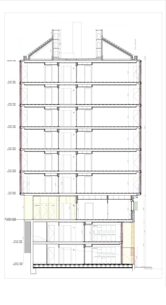 Dado la la condición del sitio —que las plantas bajas y dos inferiores bajo rasante emergen en fachada opuesta hacia el interior de manzana—, propusimos ubicar vivienda en todas las plantas. Las viviendas se diseñan conforme a las ordenanzas de diseño de VPO de 2009 (anterior al vigente decreto de habitabilidad). Los servicios e instalaciones se agrupan en torno al núcleo vertical. No existen colindancias entre unidades.