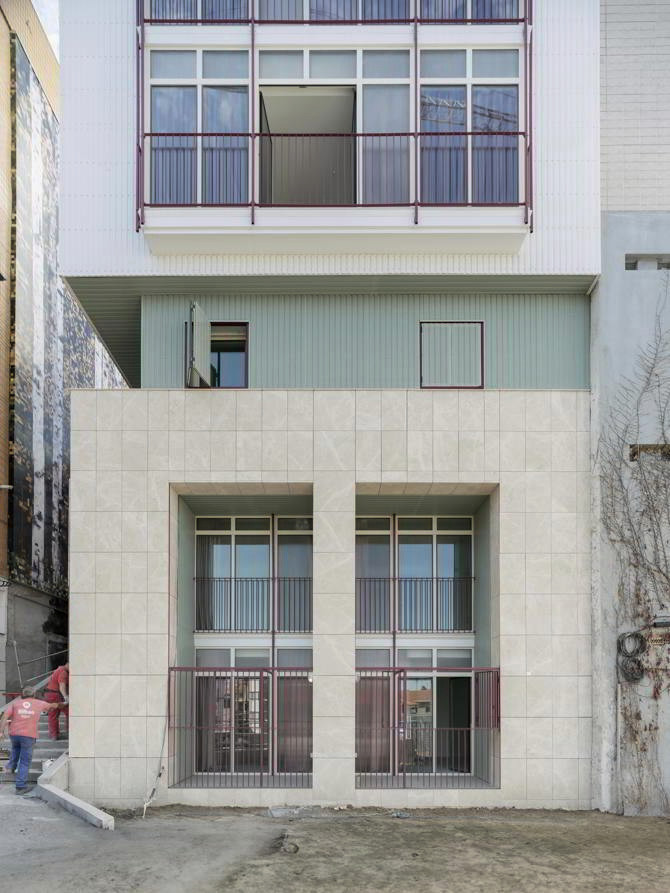 Se adoptó como solución de proyecto la versión más ‘clásica’ de mirador presente en el sitio. En la manzana en la que se inserta el edificio existen edificios con grandes miradores de madera que se extienden a gran superficie de fachada. Esta solución de mirador único, además de cualidades compositivas para el alzado, permite aprovechar óptimamente la mejor cualidad de las plantas, que es su situación de dominio visual sobre el entorno.