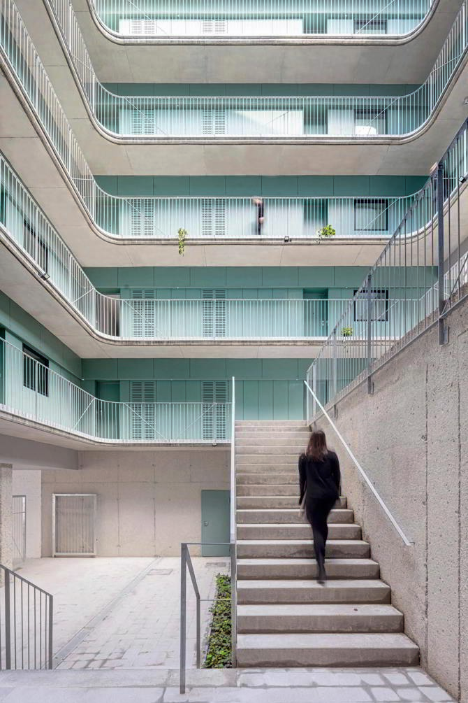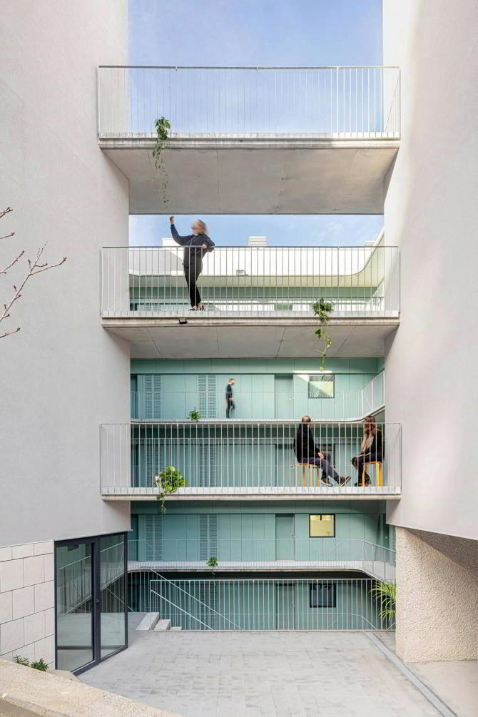 El volumen edificado es un prisma compacto que se envuelve sobre sí mismo alojando en su interior un patio abierto al sur, luminoso y aireado, que es el verdadero corazón del proyecto y que da acceso a todas las viviendas. Sus plantas se adaptan a la topografía sobre la ladera y flota sobre el terreno dejando pasar el aire y las vistas entre el norte y el sur. Pequeños ensanchamientos en las pasarelas de acceso y en las zonas horizontales ganadas a la pendiente generan lugares colectivos donde conversar o tomar el sol y así el proyecto incorpora recursos de la mejor arquitectura mediterránea con un volumen cerrado y abierto, nítido y complejo, que genera un espacio rico.