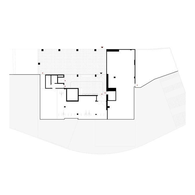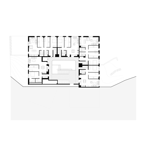 La fuerte topografía existente se modifica levemente para hacerla parte sustancial del proyecto. Las laderas que quedan sin ocupar al este y al oeste del edificio y se acondicionan con pequeños bancales que acomodan los distintos niveles del edificio, evitarán la erosión del terreno y permiten la plantación de nuevo arbolado. La escalera se pliega sobre la ladera para dar acceso directamente a las dos plantas principales, generando un paisaje interior aterrazado.
