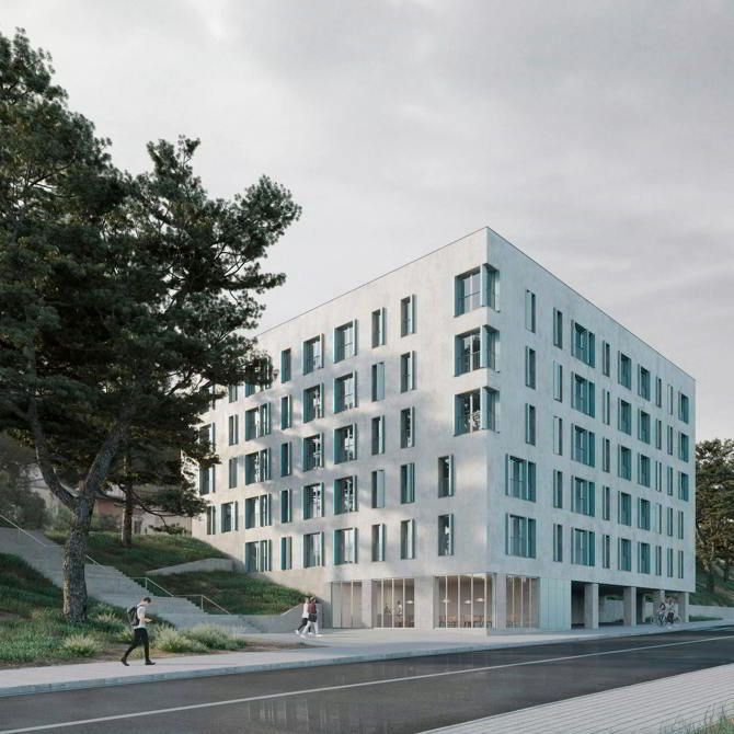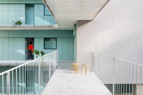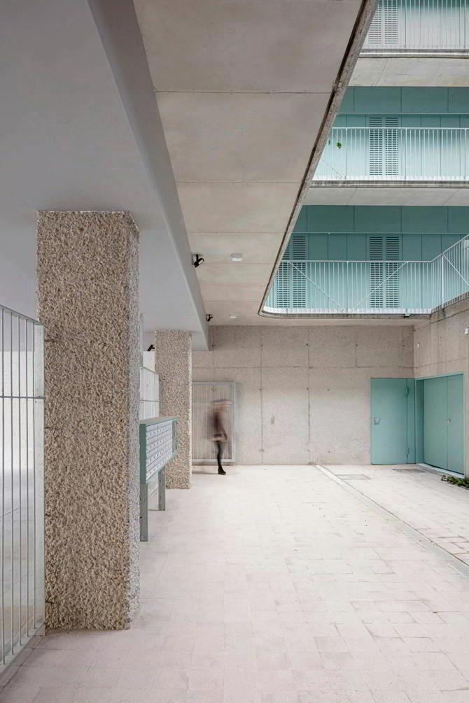 El exterior es fruto del carácter colectivo de la ciudad. Es sobrio y firme, sin embargo, el interior construye un escenario de atmósfera doméstica para los habitantes. Un hueco bien diseñado, formado por un pequeño balcón y persianas mallorquinas, articula las fachadas, y su repetición, adición y diferente posición establecen el orden general y la vibración de las fachadas.
