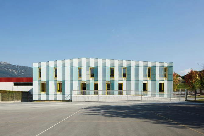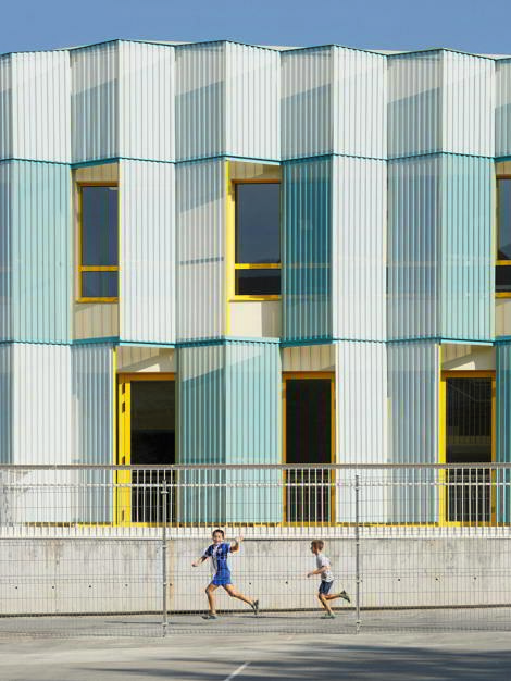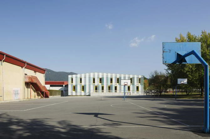 El proyecto consiste en la ampliación de una escuela de los años sesenta, del arquitecto D. José Luis Burgos. El edificio es mitad ‘dentro’ mitad ‘fuera’. Situado frente a las pistas de juego del complejo escolar del municipio ubicado en la periferia del pueblo, da a un espacio al que hasta ahora prácticamente se le han negado fachadas. Intencionadamente, la fachada evoca la relación interior-exterior, aula-patio. El patio se entiende como una prolongación de la escuela.