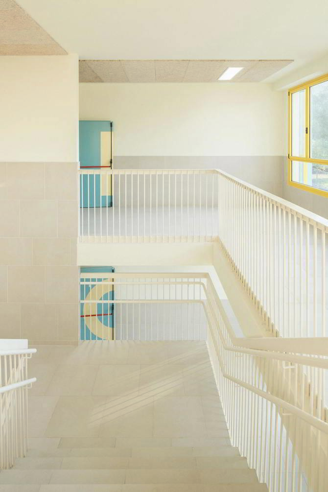 El proyecto se adosa al edificio existente y adopta su lógica. El esquema de crecimiento responde directamente a las premisas del encargo, donde un aumento en el número de aulas encaja de manera sencilla y eficaz con la preexistencia. El énfasis radica en las circulaciones, continuas, sin fondos de saco, amplias.