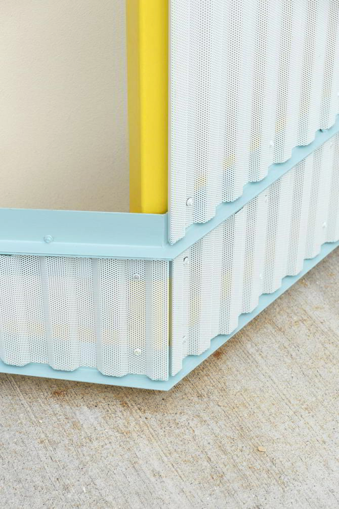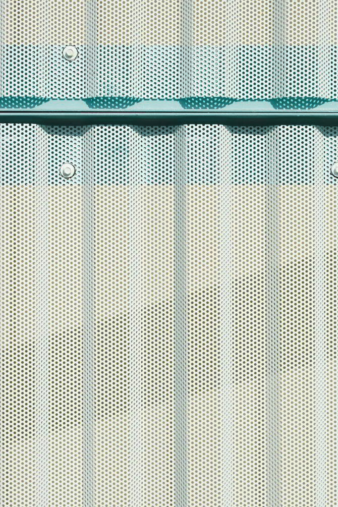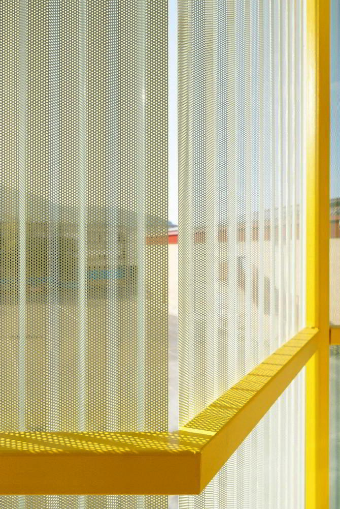 La ampliación sigue la pauta compositiva del edificio existente en las fachadas norte y sur. Sobre la fachada enfrentada al patio se proyecta un cierre plisado microperforado a modo de celosía. Esta celosía garantiza un control solar efectivo para esta orientación al mismo tiempo que ofrece suficientes garantías mecánicas para un paramento enfrentado a la explanada de pistas deportivas. En el desarrollo constructivo de este elemento se tiene en cuenta además de su resistencia mecánica, su composición geométrica para que no resulte en ningún caso escalable.
