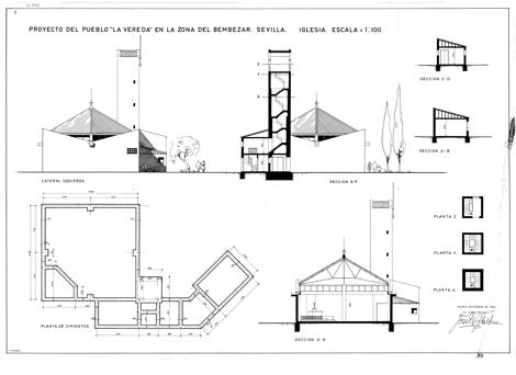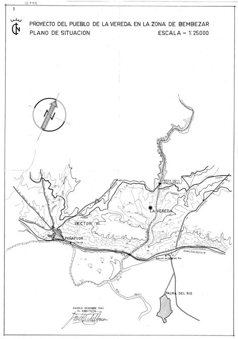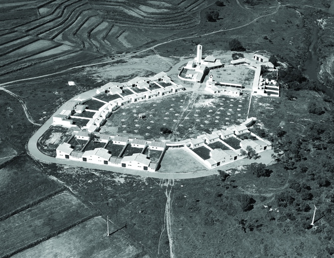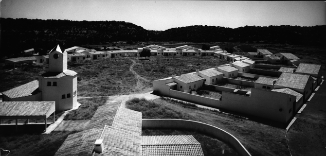 El proyecto se redacta a finales de 1963. José Luis Fernández del Amo explica de manera clara en la memoria el criterio compositivo del poblado: “El proyecto se ha concebido partiendo del concepto tradicional de una gran cortijada, dado el pequeño número de colonos que lo componen y el reducido programa de edificios públicos de que consta, evitando así el sistema urbanístico de plazas y calles y agrupando por tanto las edificaciones en torno a dos grandes patios, uno de los cuales está circunscrito por las viviendas de colonos y el otro, que se hace enteramente porticado, se cierra con los edificios públicos, quedando como separación de ambos patios el edificio de la Administración”.