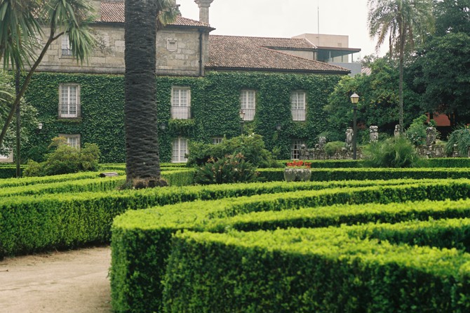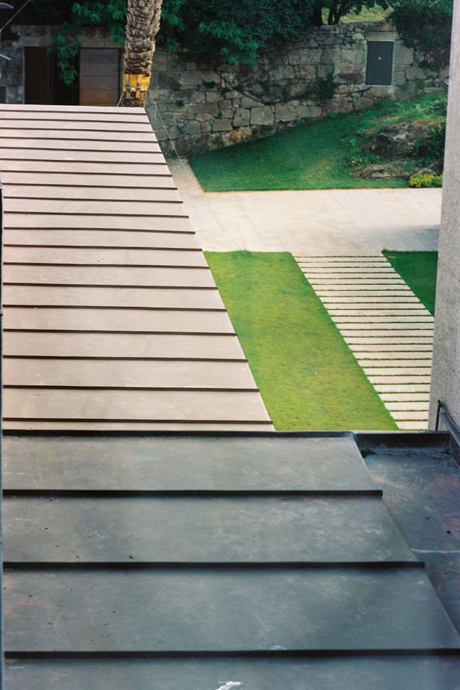 La disposición de una breve jardinera corrida a pie de muro, que en planta coincide con la grieta de luz, permitirá que este sea tapizado con hiedras introduciendo la vegetación del entorno del pazo hacia el interior. Es esta misma intención de introducir visualmente el jardín dentro de los nuevos espacios proyectados lo que ha llevado a la apertura de dos grandes huecos adintelados en la planta baja en locales donde se ubican la biblioteca y la pequeña sala de actos. Estos huecos se abren a un patio inglés limitado por un talud tallado en la roca y tapizado de musgos, helechos y líquenes que confiere a ambos espacios un carácter de tranquilidad y recogimiento, muy en contacto con el medio natural y muy adecuado a sus usos. El patio central se ha tratado como una gran explanada de césped en medio de la cual se tiende una “alfombra” de granito que conduce al nuevo vestíbulo proyectado. Esta solución facilita la adecuada implantación visual de la galería acristalada, que actúa a modo de gran espejo duplicando y ensanchando visualmente este espacio que tan pequeño e insignificante parecía antes de la intervención. Tan solo una gran palmera plantada estratégicamente como contrapeso visual de la torre situada al sur interrumpe la premeditada simplicidad geométrica de este patio ajardinado por el que se accede al ala rehabilitada. A este patio vuelcan las fachadas del edificio que han debido ser trasdosadas con ladrillo cara vista muy semejante al original, con junta a hueso, ante la imposibilidad de recuperar las fábricas originales debido a su mal estado de conservación y a los diferentes materiales empleados en actuaciones recientes. Se ha aprovechado para, eliminando pequeñas ventanas innecesarias, recuperar los huecos originales (que se cierran con grandes portalones de madera con guía superior de corredera, sistema empleado ya en las cocheras del edificio primitivo) para que, sin ser alterado el aspecto externo del edificio ni su peculiar carácter histórico le aportasen una mejor definición de volumen arquitectónico coherente. En el encuentro del hastial norte con la torre se produce un rasgado vertical de fábrica de ladrillo que tiene el objeto de iluminar el nuevo vestíbulo, al tiempo que actúa como elemento conceptual de sutura entre ladrillo y granito, los dos materiales utilizados en las fachadas del edificio. La cubierta se ha resuelto con panel sándwich de madera sobre el que se coloca la chapa de cobre clavada y engatillada a junta alzada, que sustituye a la teja cerámica plana original del edificio debido a que la planeidad de ese material contribuía a lograr una imagen volumétrica más limpia, rotunda y elegante, al ser vista la cubierta desde la galería acristalada sin distorsionar al tiempo la imagen familiar del edificio.