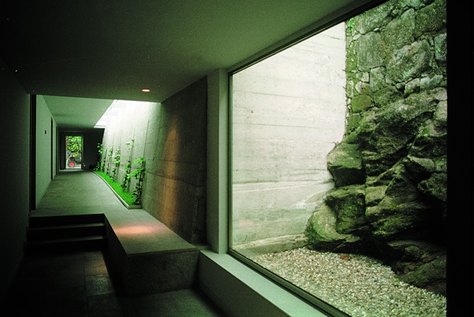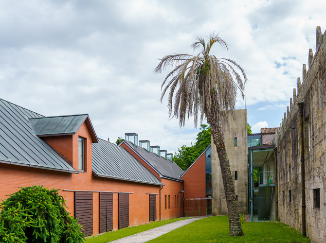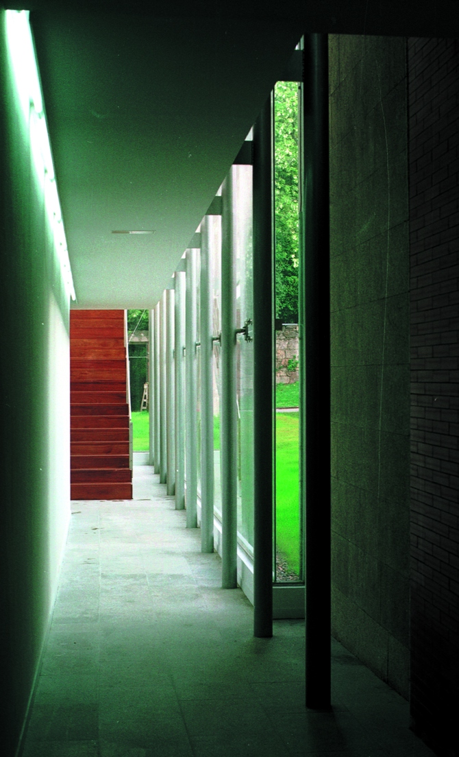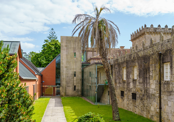 La sustitución de la galería de burdo diseño adosada en época reciente a la fachada este del pazo, por un cuerpo acristalado liviano que relaciona y conecta las dos edificaciones (cubriendo el estrecho callejón que las separaba) es una de las decisiones proyectuales importantes de la intervención. La pequeña construcción intercalada entre ambos edificios se materializa en un volumen ligero en vidrio, cobre y acero, que se escalona y retranquea para adaptarse a los distintos niveles, permitiendo siempre mantener la interesante conexión visual y la permeabilidad existente entre patio interior y jardín del pazo, descubriendo al tiempo nuevas y sorprendentes vistas de este último desde cotas superiores con la decidida “intención” de abrir los nuevos espacios proyectados de circulación y exposición al bello entorno circundante. Hacia el este y lindando con un gran muro de contención de la carretera (a cota superior) existía otro estrecho y sombrío callejón de servicio. La apropiación de este espacio para la ubicación de un corredor cubierto que distribuye a laboratorios y almacenes de pintura y arqueología es otra decisión que aporta interés a la intervención, ya que este pequeño volumen interesticial con cubierta plana se apoya en el muro de ladrillo del edificio y sutilmente en el de hormigón, dejando una ranura acristalada que permite una iluminación cenital contenida e íntima en este espacio de circulación.