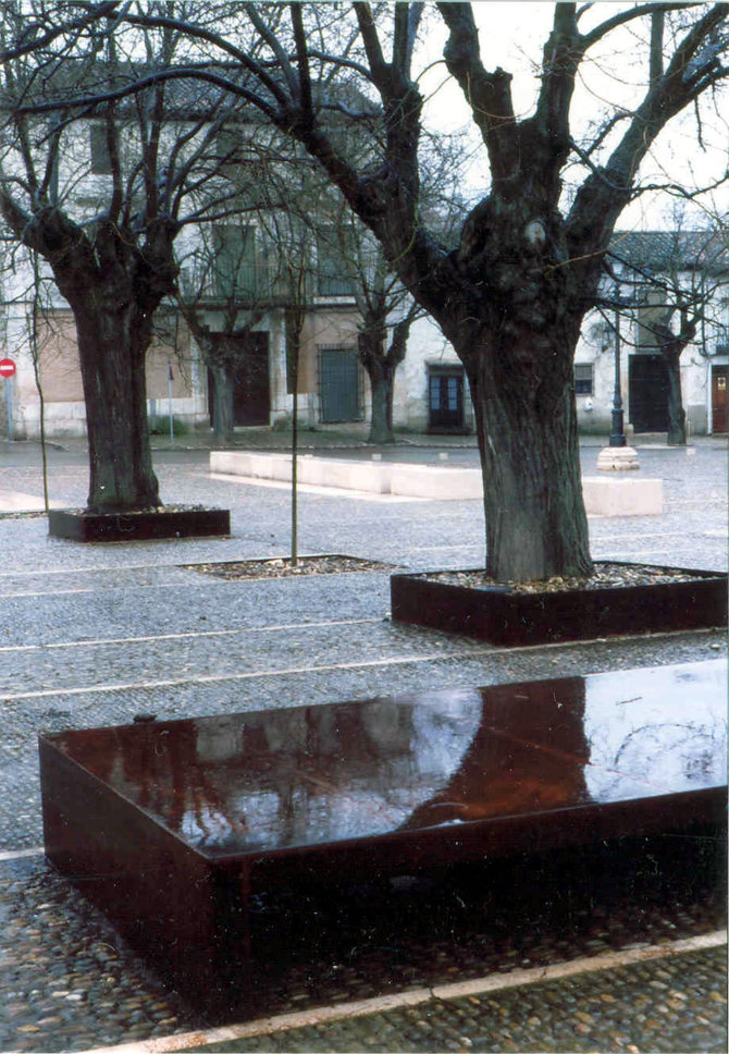 Pavimentos de canto rodado, encintados, bolardos y bancos de piedra caliza de Colmenar. Alcorques, encintados y gran banco de chapones de acero cor-tén de gran canto