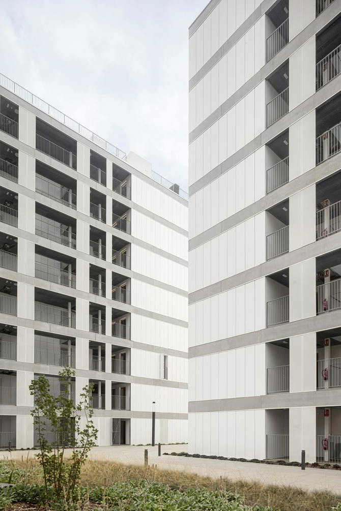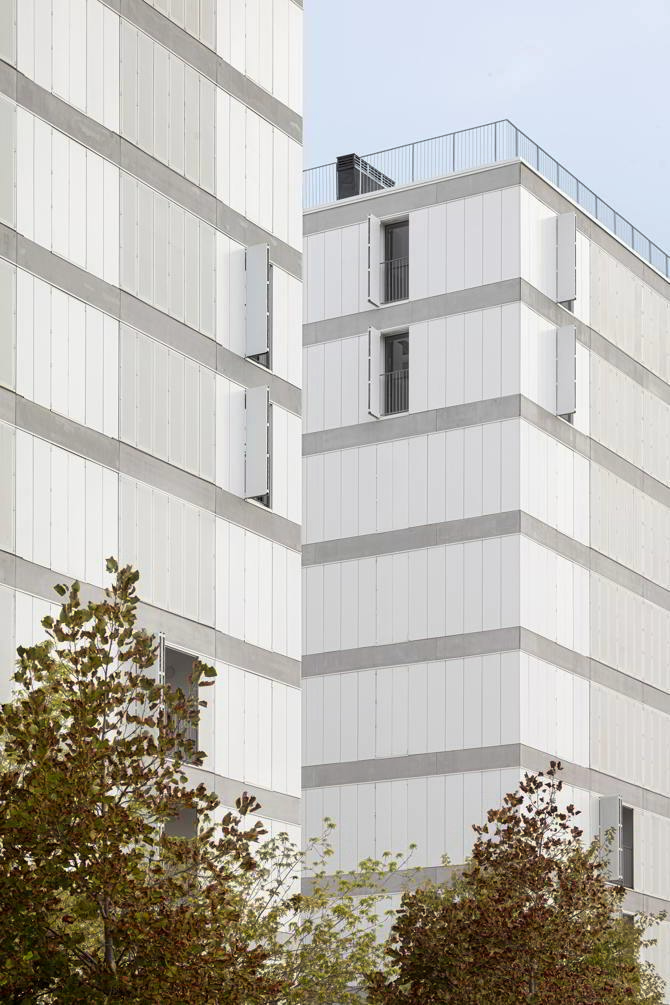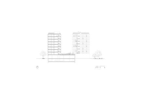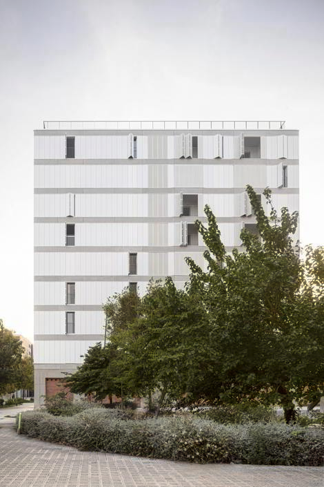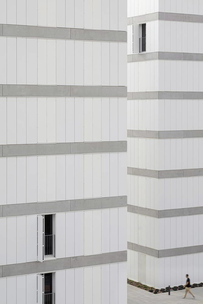 La cubierta del zócalo común funciona como jardín comunitario para los tres edificios, con una voluntad clara de continuar el espacio público que define el planeamiento. A partir de ahí se levantan tres edificios independientes, que se organizan de manera muy similar matizándose según las respectivas situaciones. Cada una de las piezas se estructura a partir de un núcleo vertical pasante, de fachada a fachada, que incluye escaleras o espacios comunitarios dependiendo del caso. Este espacio de relación y comunicación se alarga en forma de pasarela dando al jardín interior y generando la transición entre comunidad y vivienda. Este es un espacio grueso, con profundidad y riqueza espacial y programática, cumpliendo la doble función de dar privacidad a las viviendas y al mismo tiempo potenciar las relaciones entre los usuarios a partir de la apropiación de este espacio.