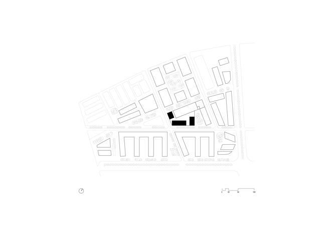 Ante la contundencia del volumen máximo definido en el planeamiento, y cogiendo el margen que el mismo planeamiento ofrece, partimos el edificio en tres piezas independientes, apoyadas sobre un zócalo común. Cada una de las piezas se articula respondiendo a los diferentes contextos inmediatos, orientaciones y programa. Esta porosidad introduce en el volumen original diversidad, visuales, relaciones volumétricas y un funcionamiento más acotado del edificio en tres partes sin renunciar a un ambiente comunitario.